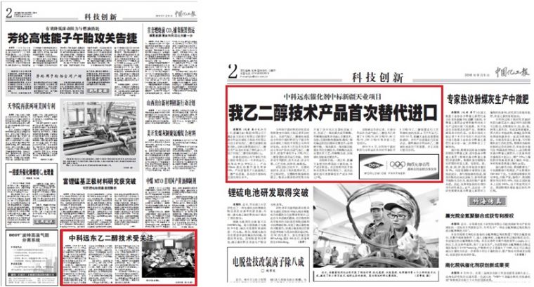 Up to now, the catalysts and the ethylene glycol synthesis technology which are developed by us have reached the domestic advanced level. For example the catalyst has been operated by Shandong Hualu Hengsheng Chemical Co., Ltd. for more than one year. The quality is superior to the oil line produced glycol product and all the technical standards have reached the leading domestic level. In September 2016, Tianchen Chemical Co., Ltd., a subsidiary of Xinjiang Tianye (Group) Co., Ltd, got the right to use our self-developed catalyst for the ethylene glycol synthesis. This marks that the independent Chinese ethylene glycol technology has realized the import substitution for the first time. It opens a new era of ethylene glycol market. This news was reported in the second edition of "China Chemical Reporter" with headline on September 4, 2016.