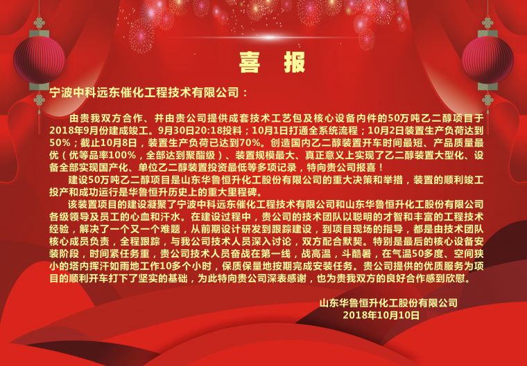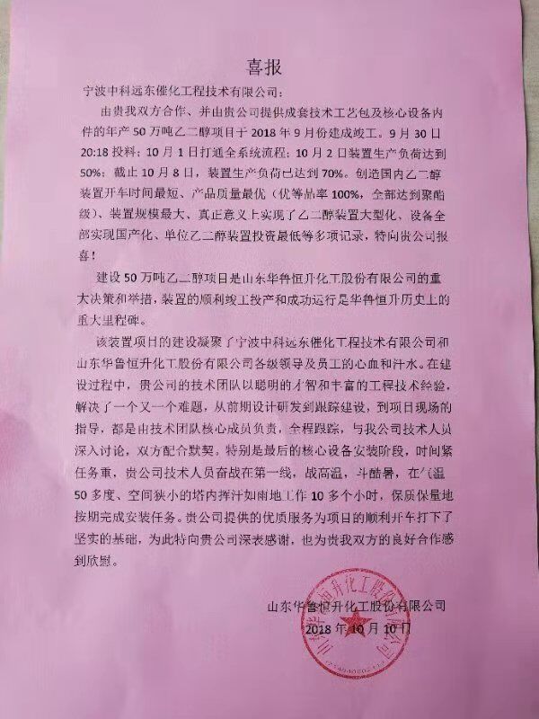在設計和建設過程中,中科遠東的設計團隊以聰明的才智和豐富的設計經(jīng)驗,解決了一個又一個難題,從前期設計研發(fā)到跟蹤建設,到開車現(xiàn)場的指導,都是由技術團隊核心成員負責,全程跟蹤,與華魯恒升技術人員深入討論,雙方配合默契。為此,山東華魯恒升化工股份有限公司公司發(fā)來喜報,感謝寧波中科遠東催化工程技術有限公司在此過程中提供的優(yōu)質(zhì)技術和優(yōu)良服務。